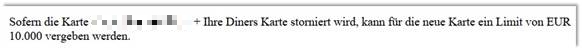 Sofern die Karte xxx xxxx xxxx yyyy + Ihre Diners Karte storniert wird, kann für die neue Karte ein Limit von EUR nn.nnn vergeben werden.