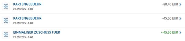 Die neue Karte ist noch nicht zugestellt, schon sehen wir in der App die Jahresgebühr von 80,40 Euro und die Zusatzkartengebühr von 45,60 Euro, die einmalig gutgeschrieben wurde.